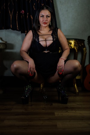 Eine selbstbewusste Frau mit tiefem Blick und feinem Auftreten.